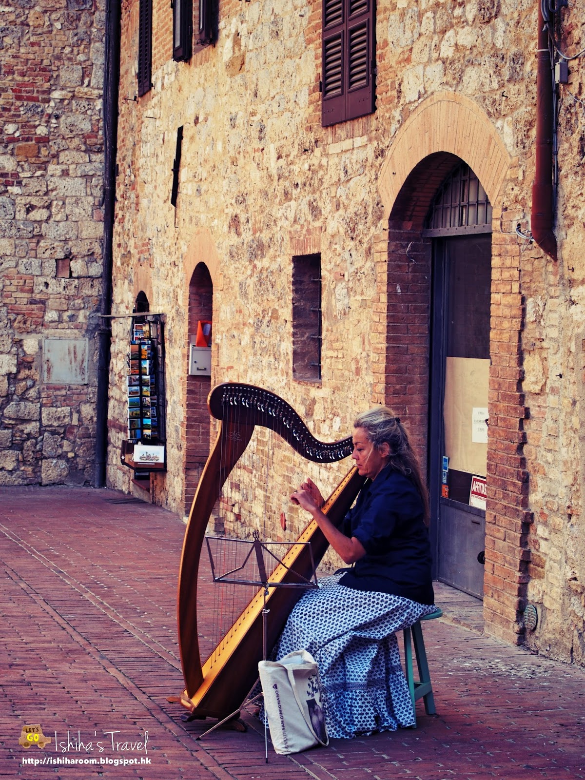 參觀完Cappella di Santa Fina, 出返去廣場, 有很悅耳的豎琴聲